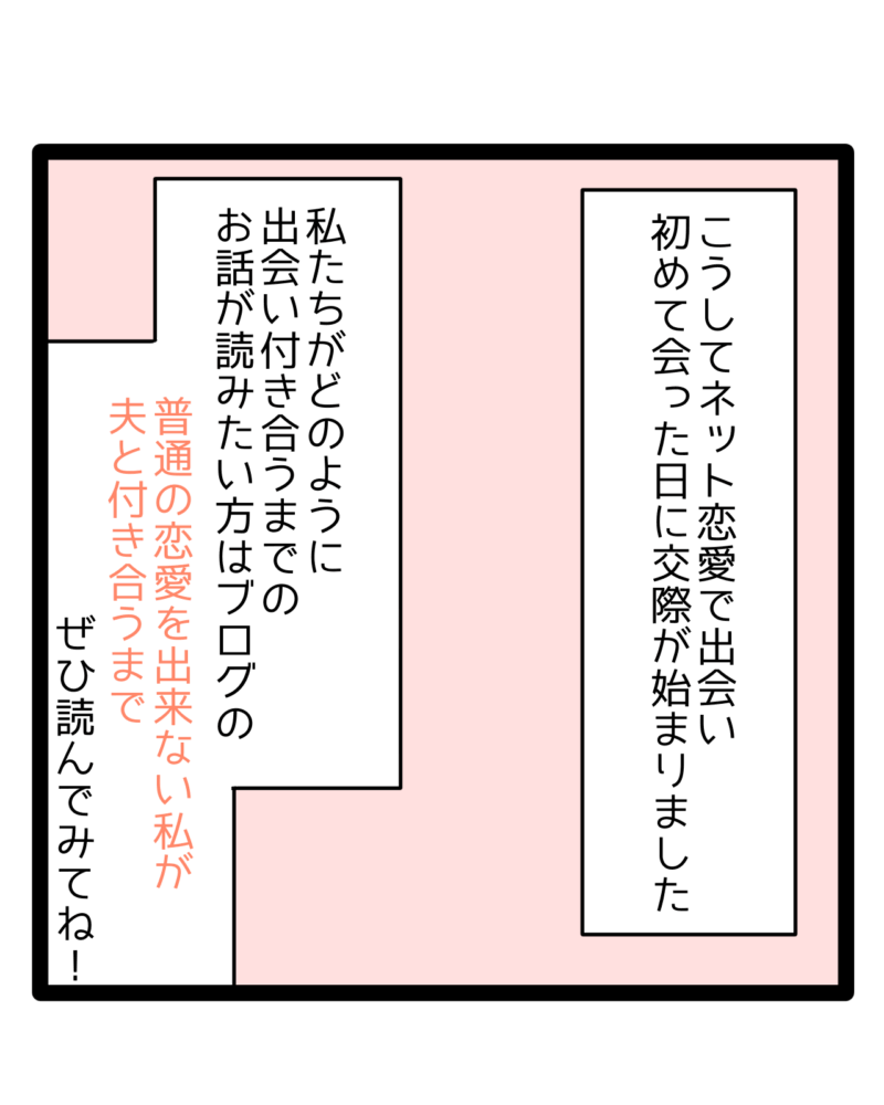 前に私がどうして普通の恋愛を出来ないのか、苦手なのかについてと夫であるくーとの出会い実際に付き合う日までを描いています